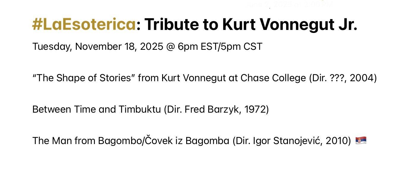 Join me Tuesday @ 6pm EST/5pm CST when #LaEsoterica has a Tribute to American writer, philosopher and activist Kurt Vonnegut Jr. Feature Presentation: “Between Time and Timbuktu” (1972). Playlist available here (https://youtube.com/playlist?list=PL2Zslnc5XTfuwfDaWkzxZitAzvR3z9WSK&si=spVGFr1himZ7Fa3r) See you there💕