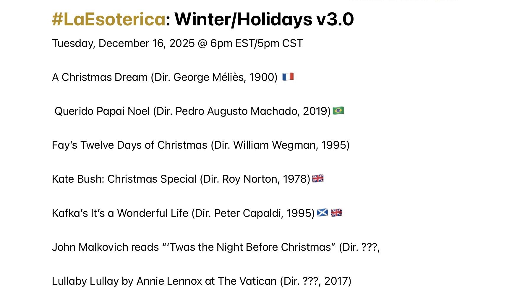 Join me Tuesday @ 6pm EST/5pm CST when #LaEsoterica explores our annual Winter/Holiday theme. Feature Presentation: “Kate Bush: Christmas Special” (Dir. Roy Norton, 1978)🇬🇧 Playlist available here (https://youtube.com/playlist?list=PL2Zslnc5XTfuQFMeqhk_oMT0Gz-SykW6z&si=JUuAe02B6P0U3BP0) I hope you can make it💕