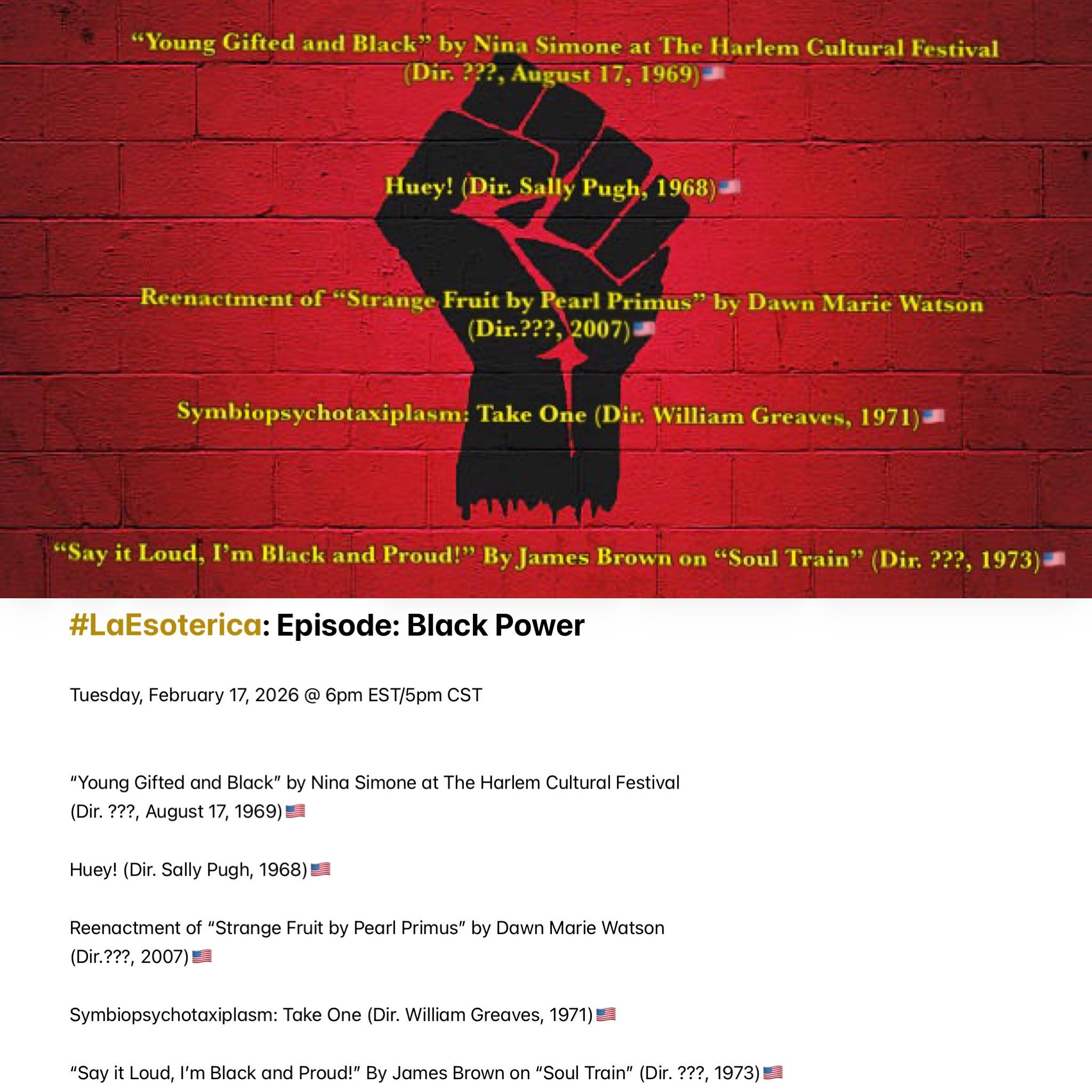 Join me Tuesday @ 6pm EST/5pm CST when #LaEsoterica explores film and music focused on Black Power. Feature Presentation: “Symbiopsychotaxiplasm: Take One” (1971). Playlist available here (https://youtube.com/playlist?list=PL2Zslnc5XTfsDZo0GzKGOqaQ1X6fDR6k2&si=LfGyKqCfrK2sTWNN)