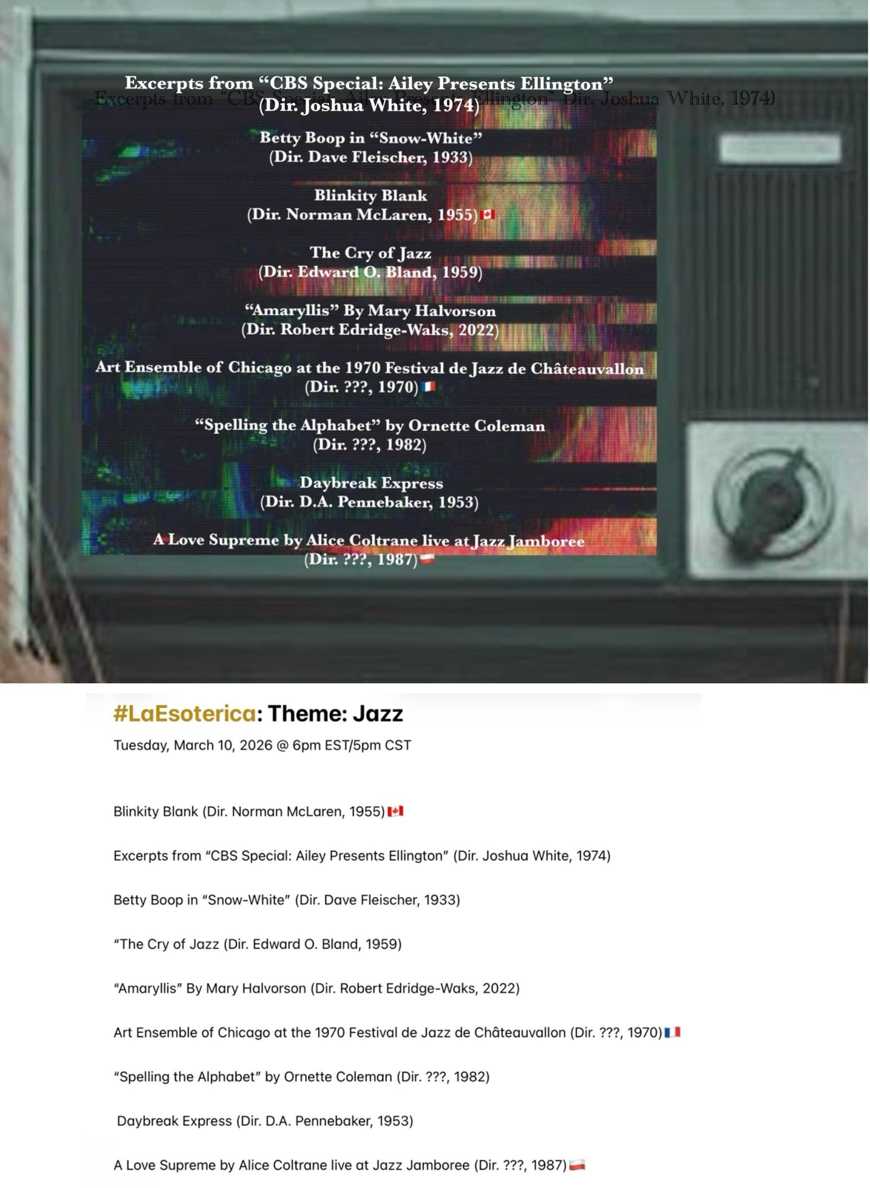 Join me Tuesday @ 6pm EST/5pm CST when #LaEsoterica explores experimental #Jazz. Feature presentation (s): The Cry of Jazz (1959) & Art Ensemble of Chicago at the 1970 Festival de Jazz de Châteauvallon. Playlist available here (https://youtube.com/playlist?list=PL2Zslnc5XTftGN8jJTrIhjbvXfv8Uu7hn&si=2mQVEmp5RC189Sys)