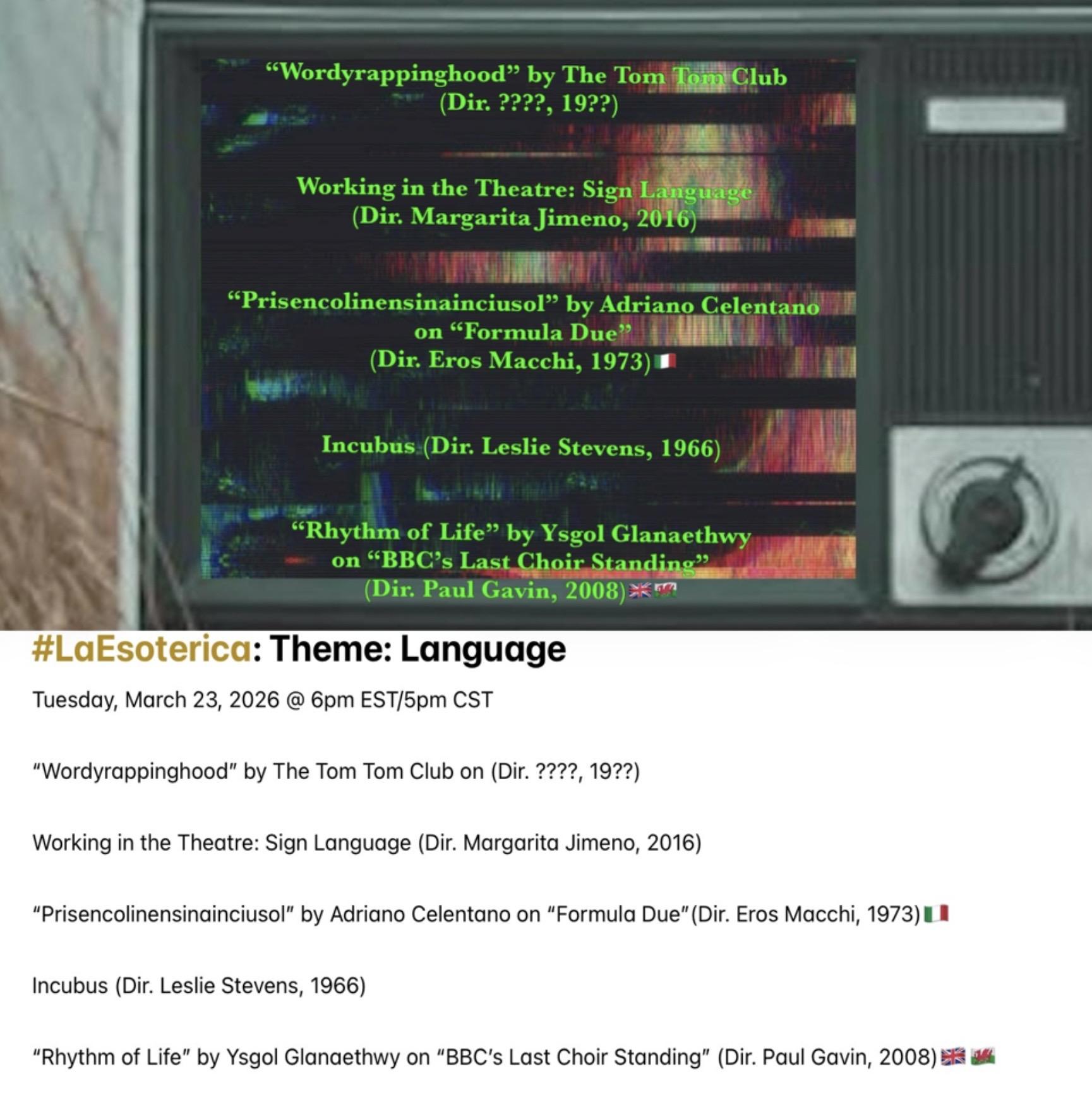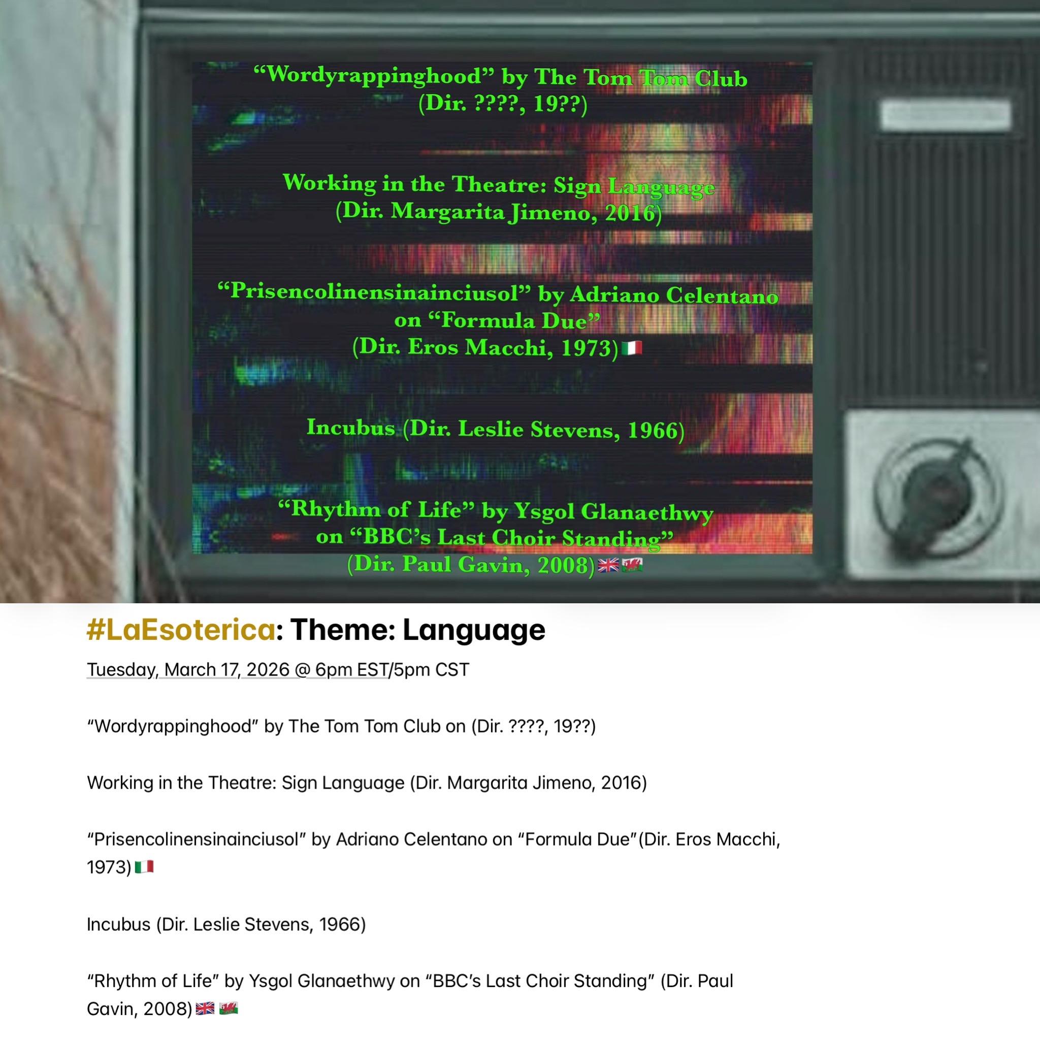Join me @⚠️SUPER SPECIAL RESCHEDULED TIME⚠️ MONDAY AKA TODAY @ 6pm EST/5pm CST when #LaEsoterica explores experimental uses of Language. Feature presentation: #Esperanto language #horror “Incubus” (1966). Playlist available here (https://youtube.com/playlist?list=PL2Zslnc5XTftC29fe6Lqlax9S8Gl4uoB2&si=VPJSJIP2bLjDydz4)