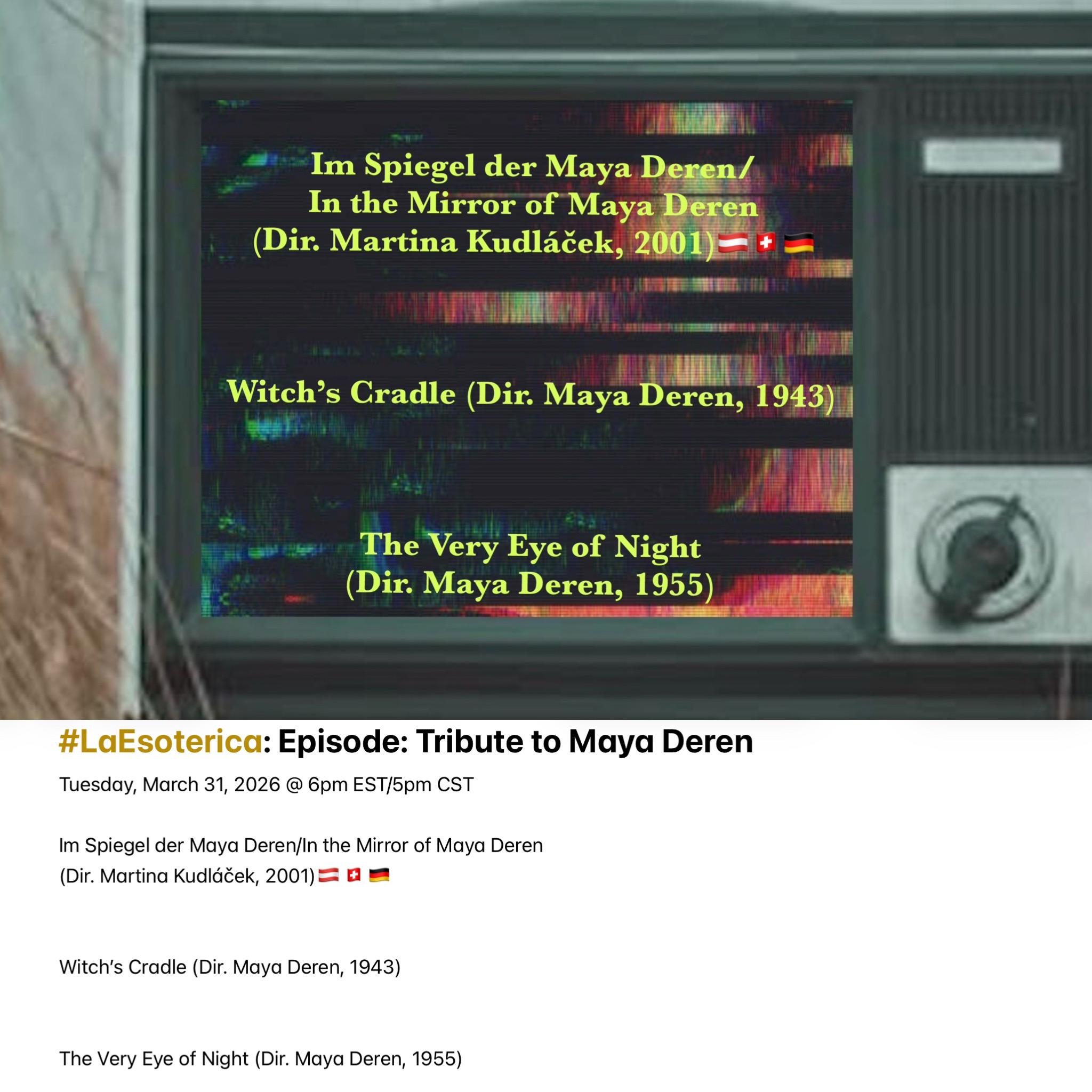 Join me Tuesday @ 6pm EST/5pm CST when #LaEsoterica closes out #WomensHistoryMonth with a Tribute to Avant-Garde auteur Maya Deren. Feature Presentation: “In the Mirror of Maya Deren (2001)🇦🇹🇨🇭🇩🇪 . Playlist available here (https://youtube.com/playlist?list=PL2Zslnc5XTfv28Iu1oDZQN-hgM8E26KxO&si=bQhI-eP84uvXzGfB)