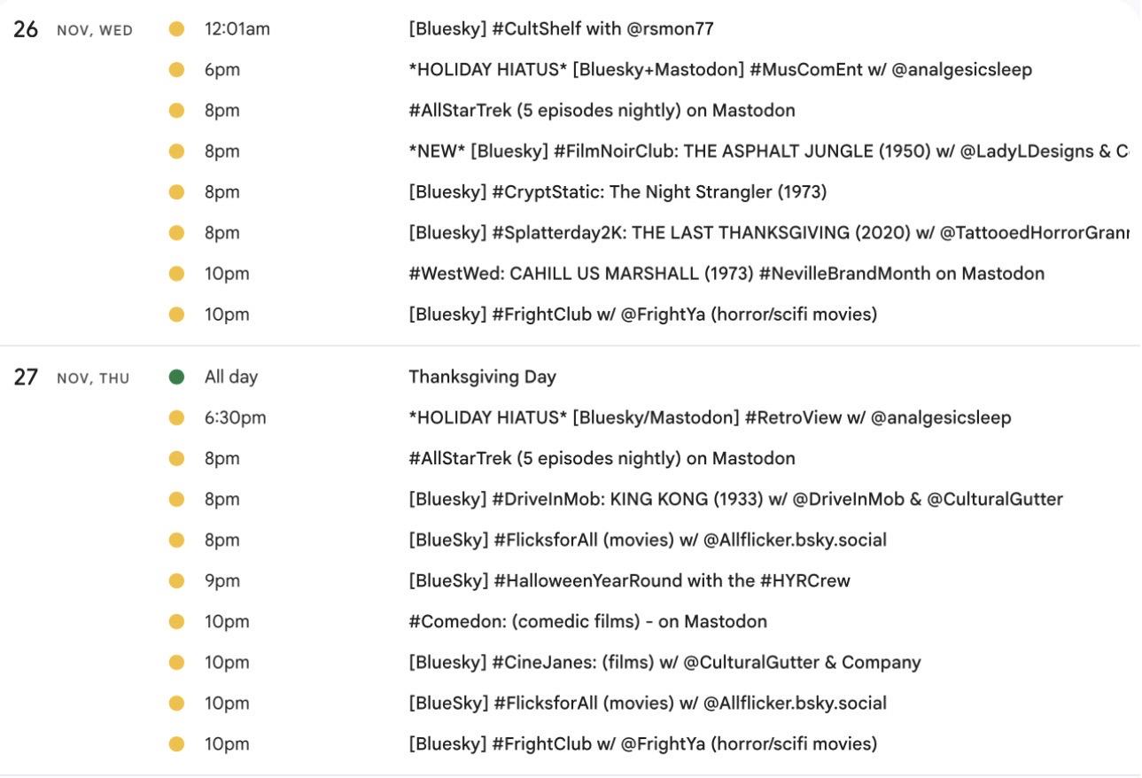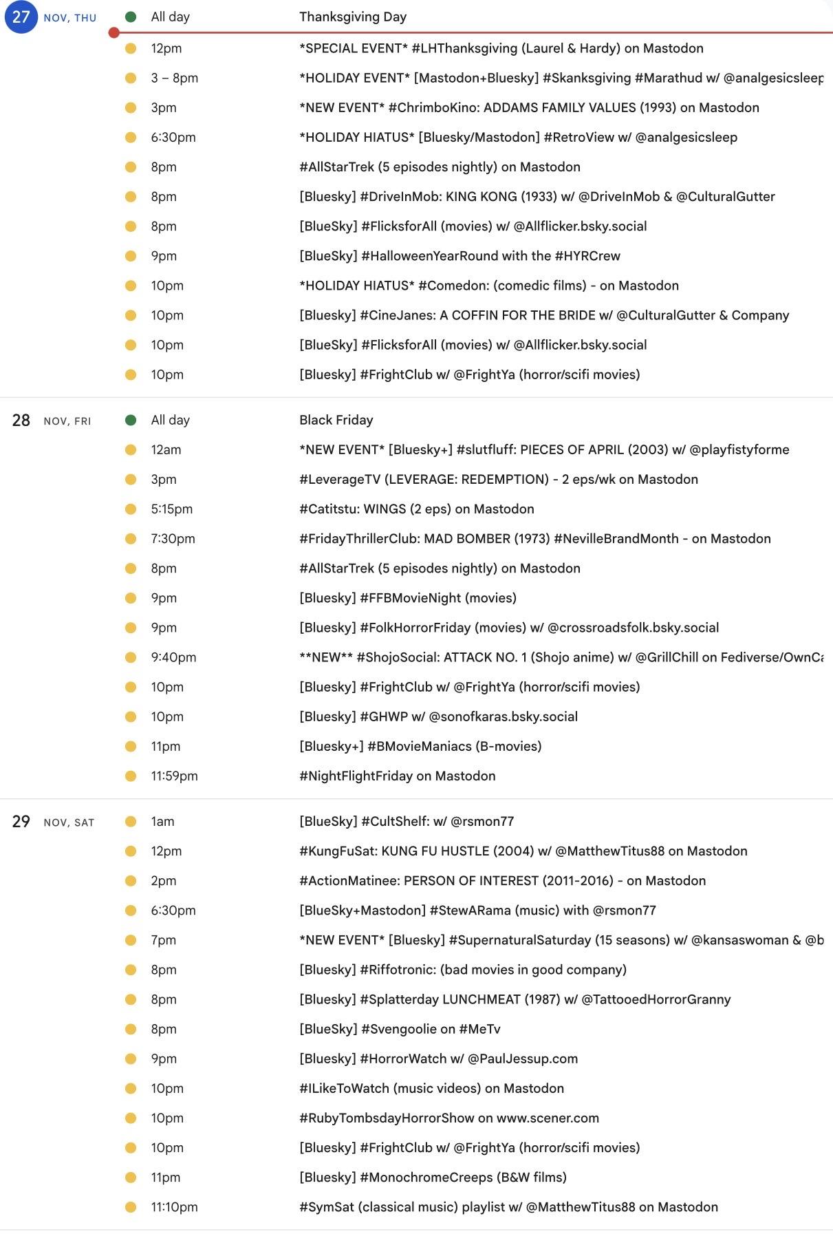 🦃 Note 🇺🇸 holiday schedule changes! 📺 It's the weekly THU-THU🐘 #Mastodon/ #Fediverse #WatchPartyCalendar 📅 for Nov. 20-27, 2025