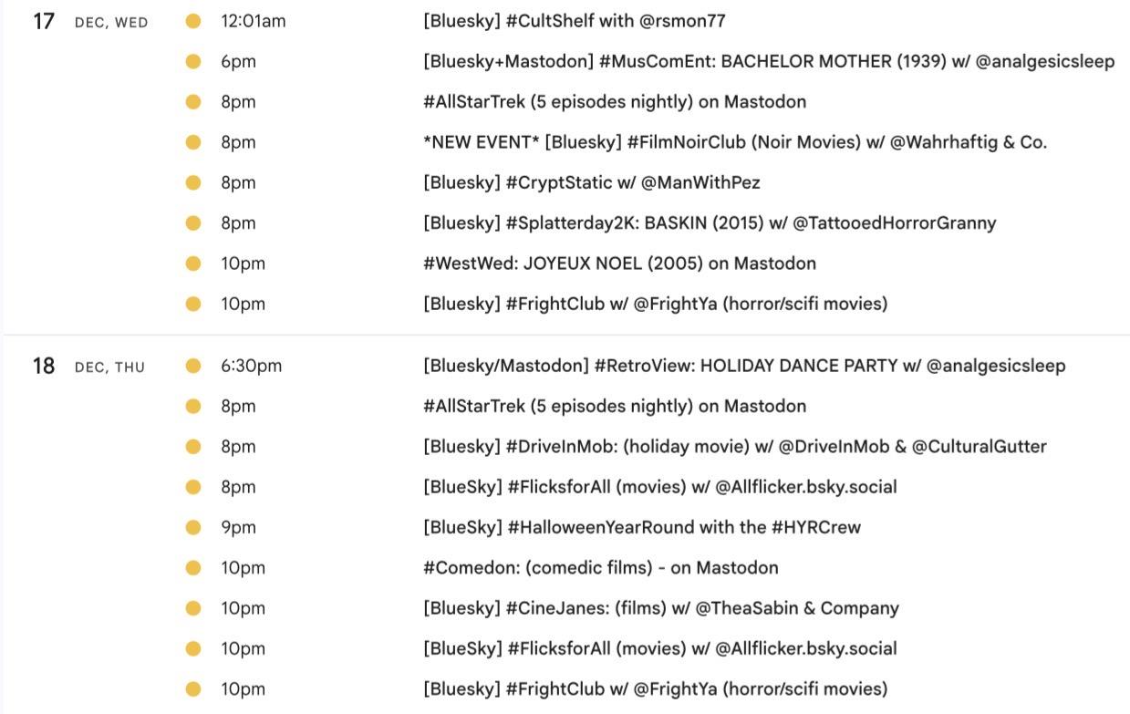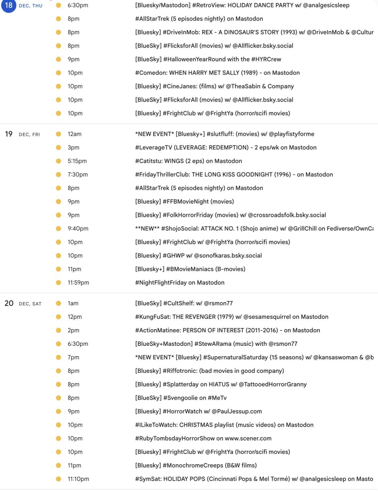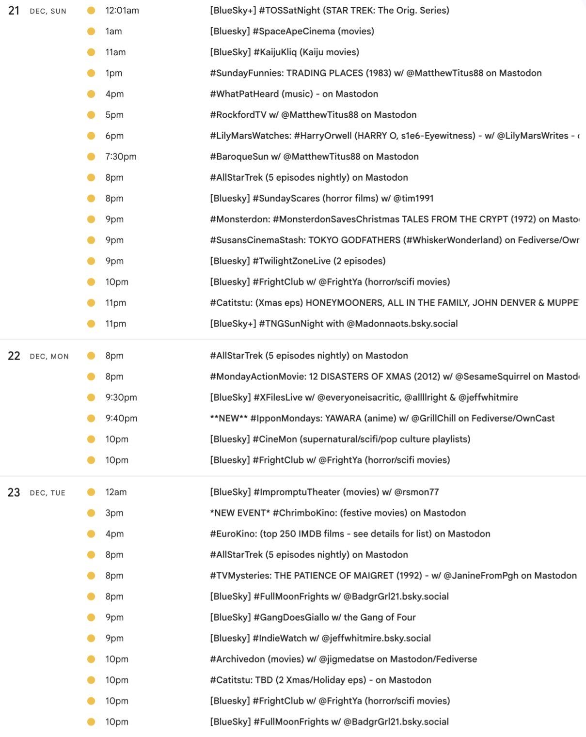 📺 It's the weekly #Mastodon/ #Fediverse #WatchPartyCalendar for Dec. 18-25 ❄️(Thu-Thu)